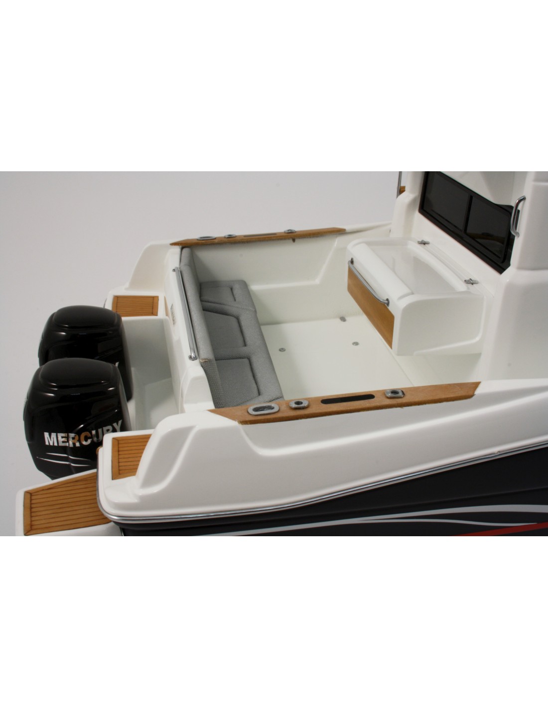 Deck fitting parts in chromed brass, custom made, slatted wooden deck. 4 layers of paint and 2 coats of varnish are applied to obtain a ” gel coat” quality.